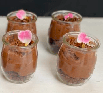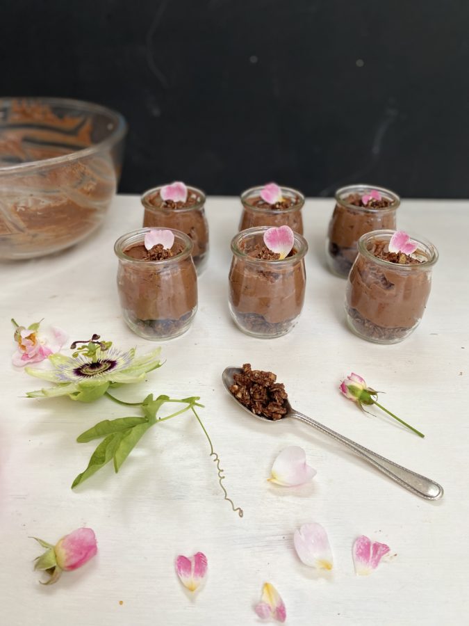 - Spoon the chocolate mousse on top of the granola and smooth a little.