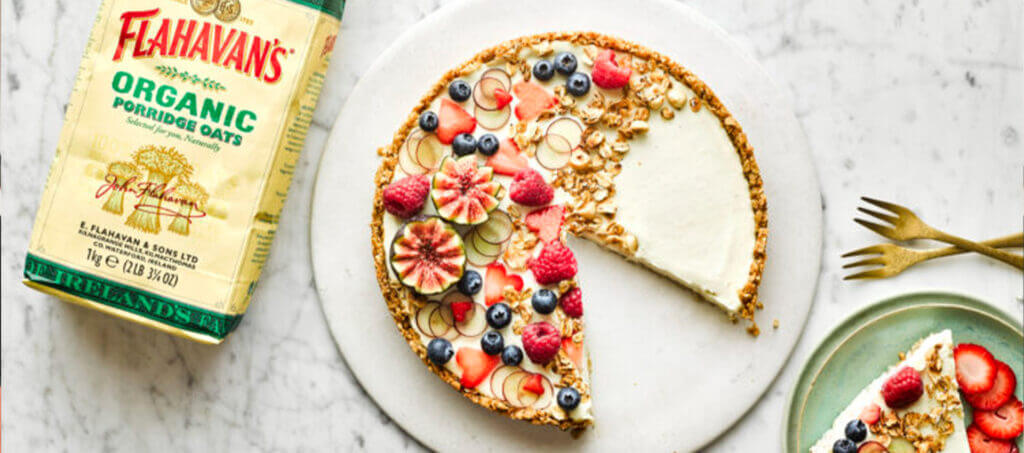 10- Remove the tart from the tin by gently heating the edges to release it – you can do this with a cloth soaked in a little hot water – and slide the tart onto a serving plate. Gather together the berries, figs and toasted Flahavan’s Organic Jumbo Oats and arrange as you please. Slice into wedges to serve, and enjoy!