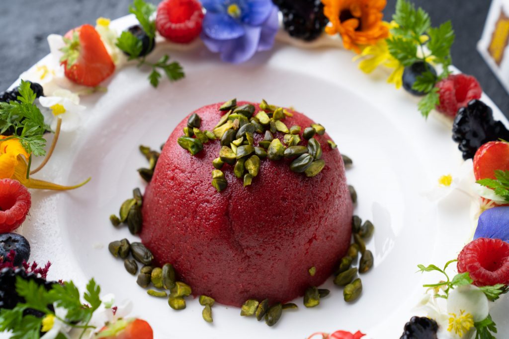 Remove the pudding from the mould and transfer into each serving dish and finish with the crushed pistachio.