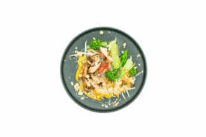 • Prepare the rice noodles following the package guidelines and place in the pan, toss and stir well. Sprinkle over the crushed peanuts
