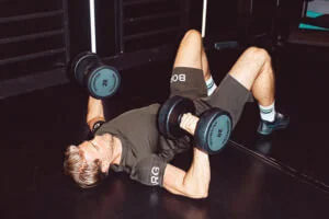 This session is more of a core and finisher exercise, so pick a width of your stance that makes you work hard to keep both feet pressed hard against the floor and your hips as stable as possible throughout the movement. The same goes for the dumbbells, here’s an opportunity to test your limits and see how heavy you can go without compromising on form. But don’t go too heavy so you just throw the dumbbells around without control, that won’t be helpful for anyone! Perform 12 heavy reps.